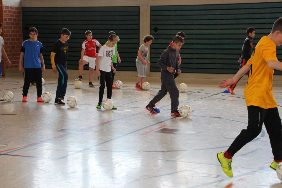 Hoch konzentriert ging es an der Bühlschule zu, als Ervin Skela, ehemaliger albanischer Rekord-Nationalspieler, den 30 Kindern Tipps und Tricks am Ball zeigte