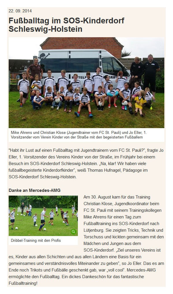 Du bist hier: Startseite / Jo Ellers Arbeit als sportlicher Leiter bei Kinder von der Strasse e.V. / Presseberichte (Kinder von der Straße e.V.) / SOS-Kinderdorf Schleswig-Holstein vom 22.09.2014